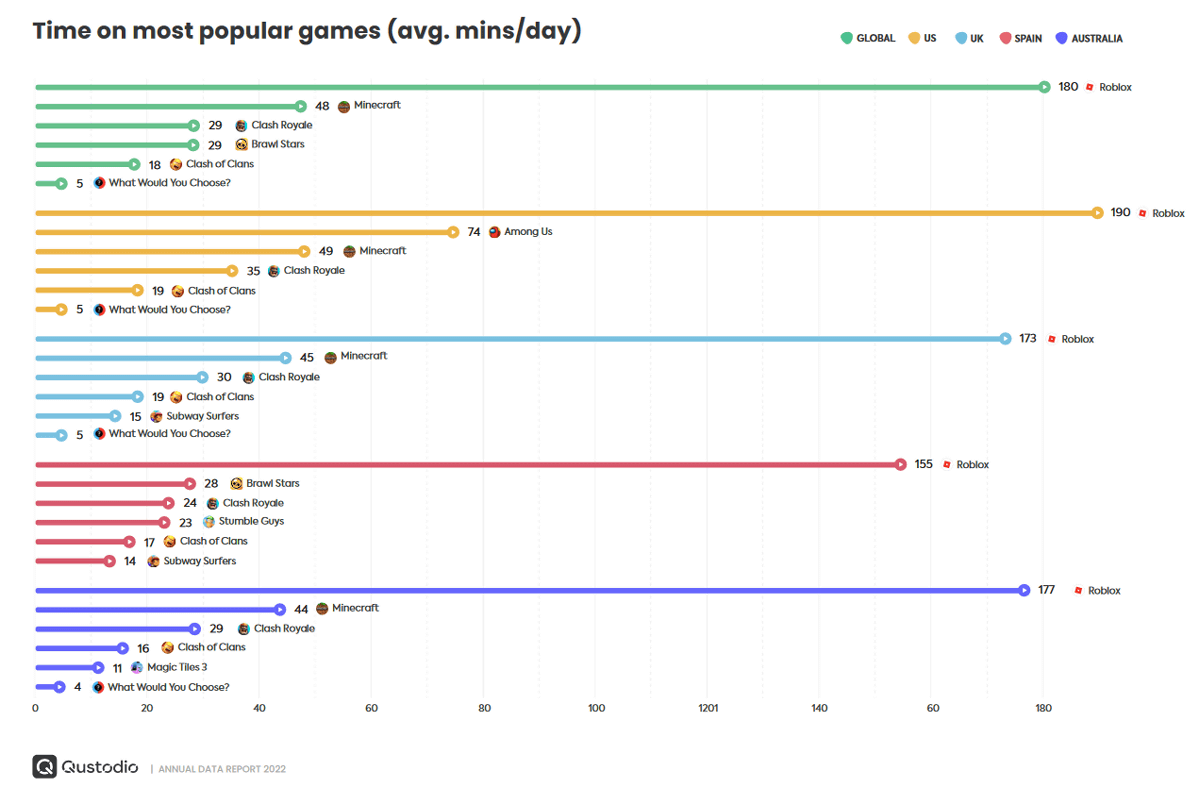 또한 아이들의 59%가 온라인 게임 플랫폼인 Roblox에서 놀고 있으며 평균적으로 하루에 180분을 소비하는 것으로 나타났습니다.