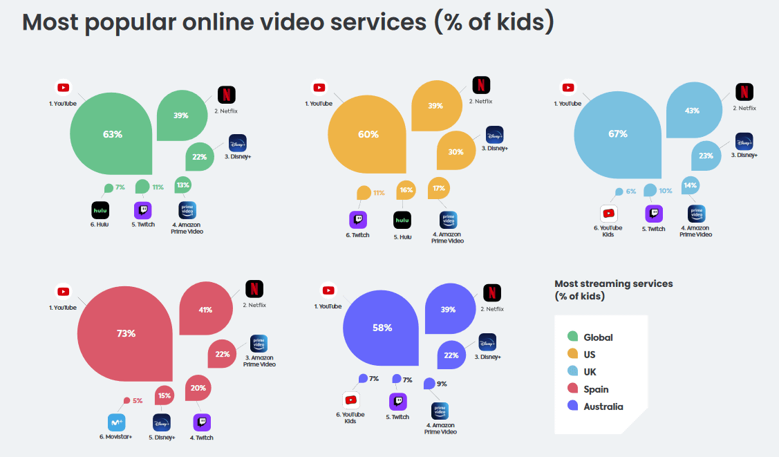 Qustodio에 따르면, 아이들이 동영상 전달 서비스에 소비하는 시간은 2022년에 18% 증가했다는 것.