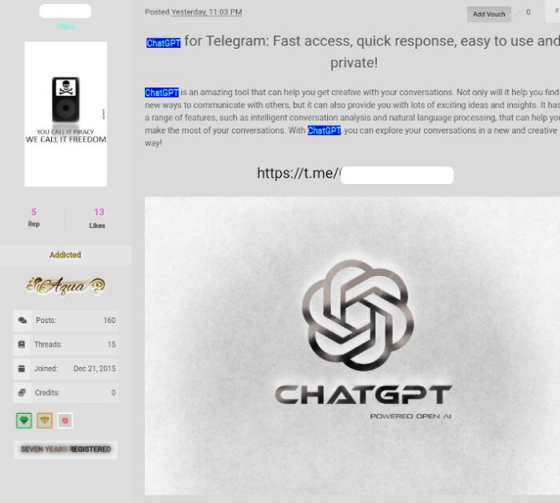 ChatGPT에는 불법 콘텐츠의 생성을 차단하는 기능이 탑재되어 있지만, 사이버 보안 기업 Check Point Software의 연구자는 해커가 "ChatGPT의 제한을 회피하고 악성코드를 만들 수 있도록 하는 서비스"를 판매하고 있다고 보고했습니다.