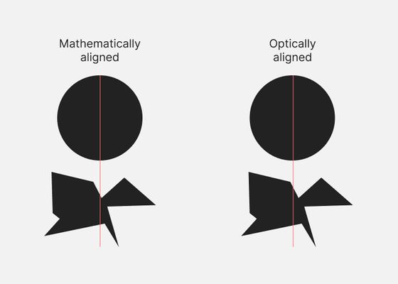 수학적으로 올바른 위치에 배치한 디자인(왼쪽)도, 실제로는 좌우나 상하에 치우쳐 밸런스가 나빠 보이는 일이 있습니다. 그럴 때는 시각적으로 보았을 때 밸런스가 좋은 디자인(오른쪽)으로 하는 것이 좋습니다.