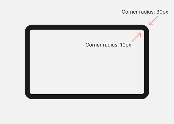 둥근 모서리를 시각적으로 위화감 없이 보여주고 싶은 경우는, 내측 모퉁이의 반경을 외측의 모퉁이의 반경보다 작게 합니다. 구체적으로는, 외측 모퉁이의 반경이 30픽셀로, 내측 모퉁이까지 20픽셀의 거리가 있는 경우, 안쪽 모퉁이의 반경은 30에서 20을 뺀 10픽셀로 합니다.