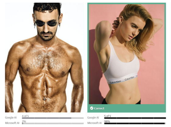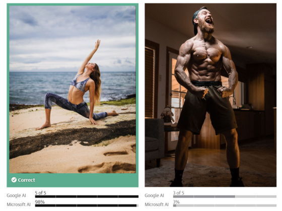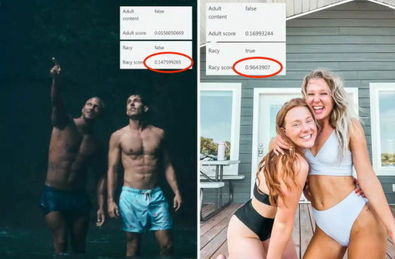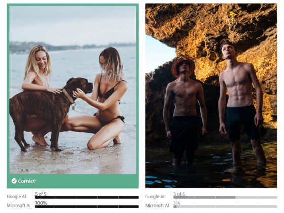 Guardian은 Google과 Microsoft에서 제공하는 콘텐츠 중재 AI를 사용하여 수백 장의 사진을 테스트했습니다. 그 결과, AI는 분명 남성보다 여성의 사진을 '성적'이라고 판정하는 경향이 있다는 것이 판명되었습니다. 예를 들어 왼쪽 사진에 대한 음란도는 Google의 AI에서는 '5단계 중 5', Microsoft의 AI에서는 '100%'로 판정되었지만 오른쪽 사진은 Google의 AI에서 '5단계 중 3', Microsoft의 AI에서 '3%'였습니다.