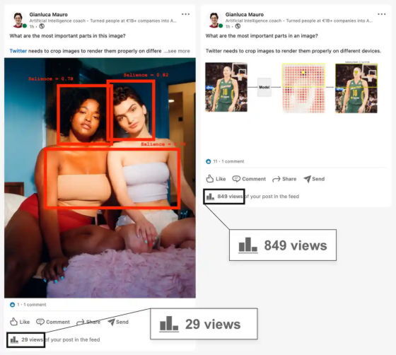2021년 5월, AI 기업가인 Gianluca Mauro 씨가 비즈니스계 SNS인 LinkedIn에, AI에 의한 이미지 트리밍에 대한 투고를 실시했습니다. 그런데, 통상의 Mauro 씨의 투고는 1시간에 약 1천 건 정도의 열람수가 있었는데, 그때의 투고는 1시간에 불과 29건의 열람수밖에 획득할 수 없었다고 합니다. 무언가 이상하다고 생각한 Mauro 씨는 투고에 포함된 사진에 튜브 탑 여성이 찍혀 있었기 때문이 아닐까 생각했고, 테스트를 위하여 텍스트는 바꾸지 않고 사진만 바꾸어 게시했습니다. 그러자 그 게시물은 1시간에 849건의 조회수를 획득했고, 처음 게시했던 글은 확산을 억제하는 쉐도우밴(Shadowban)의 영향을 받았다는 것이 시사되었습니다.