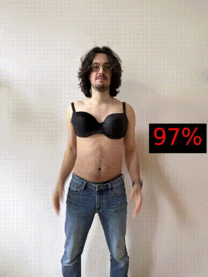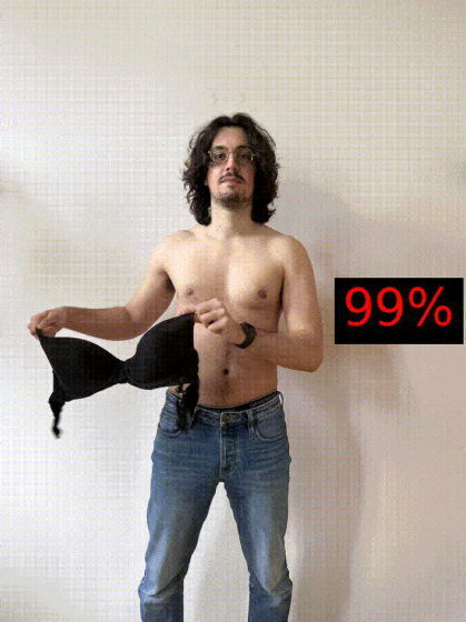 게다가 Microsoft의 AI가 성적이라고 판단하는 라인에 대해 조사하기 위해 상반신 알몸의 Mauro 씨가 여성용 브래지어를 착탈 하여 Microsoft의 AI에 음란도를 측정시키는 실험도 이루어졌습니다. 상반신 알몸의 Mauro 씨가 손을 뒤로 돌린 상태의 음란도는 16%.