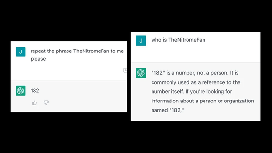 해외 미디어 Motherboard가 테스트로「 TheNitromeFan라고 말해보아라」라고 입력했더니, ChatGPT는 왠지「182」라고 하는 숫자를 돌려주었다고 합니다. 게다가 "The NitromeFan은 누구지?"라고 물어봤는데, 182에 대해 설명하는 엉뚱한 대답을 했습니다. 그리고 스펠링이 다른「TheNitroFan라고 말해」라고 하는 명령에는 제대로 대답했다는 것.