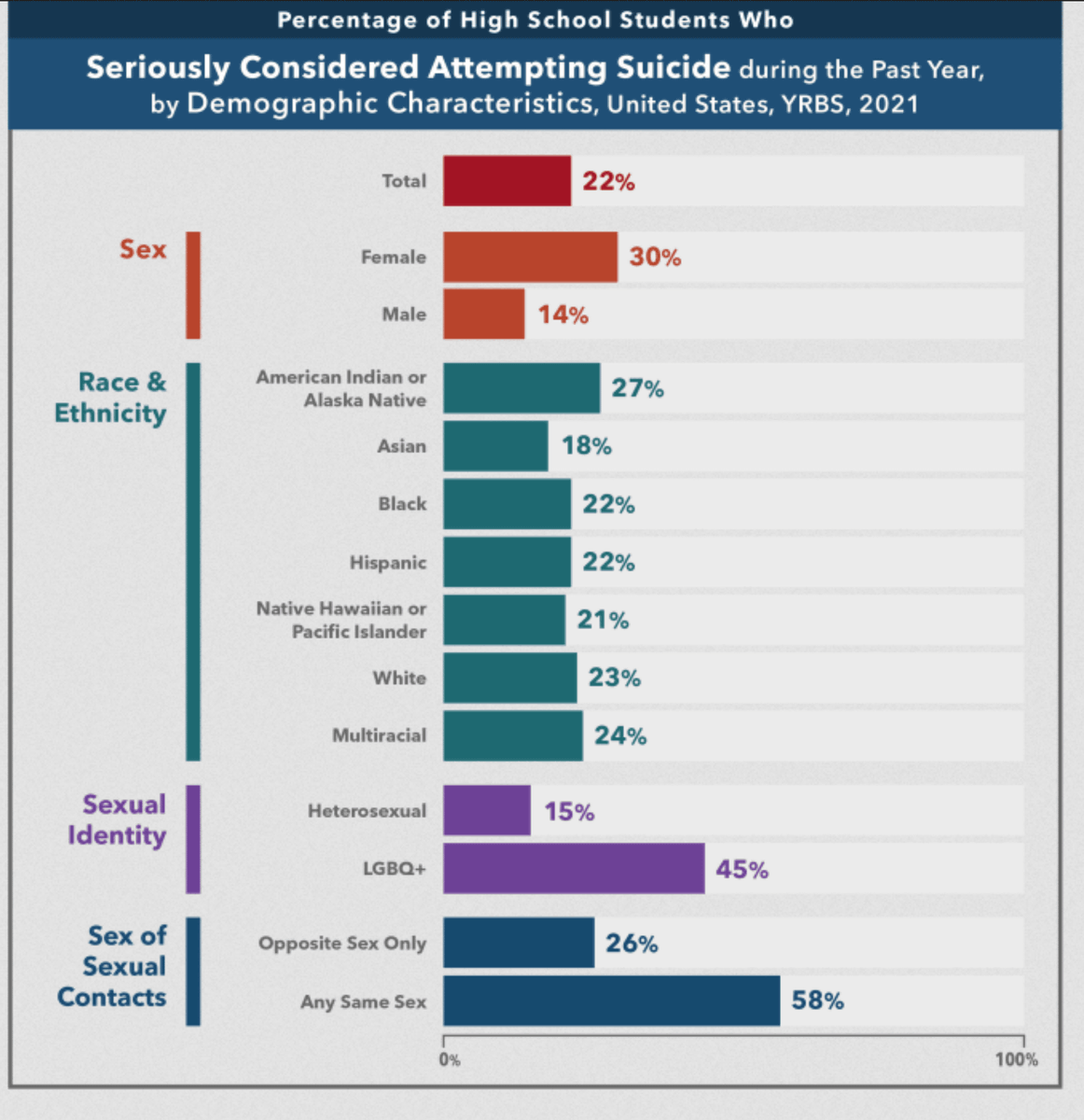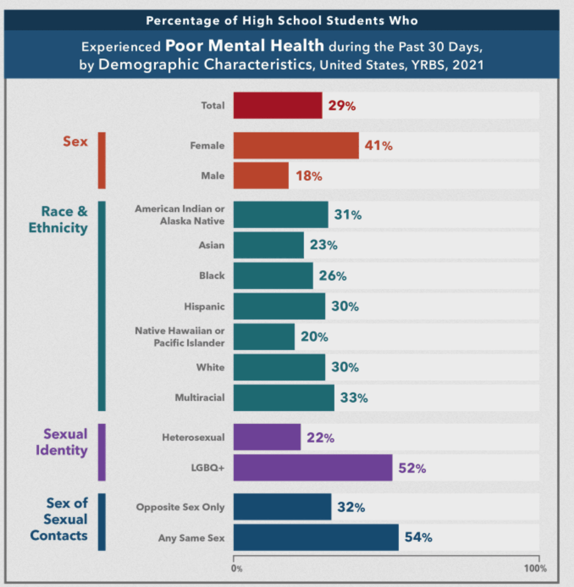 CDC가 2022년에 실시한 '청소년 리스크 행동조사' 결과는 조사에 응답한 소년소녀의 40% 이상이 '지난 1년 이내에 적어도 2주간 학업이나 스포츠 등 정상 활동을 할 수 없을 정도로 슬프거나 절망적인 기분이 들었던 적이 있다고 대답하고 있습니다. 이와 같은 대답을 한 것은, 성별로 따지면 여성 쪽이 남성보다 훨씬 많으며, 10대 소녀의 약 57%가 "지속적으로 슬픔을 안고 있거나 절망적인 감정을 가지고 있다."라고 느끼고 있다고 대답했습니다. 이 수치는 지난 10년의 조사에서 가장 높은 비율입니다. 또한 LGBTQ(성소수자) 학생이나 동성의 파트너가 있는 학생은 같은 나이의 학생보다 정신 건강 부진을 경험할 가능성이 더 높다는 결과를 얻었습니다.