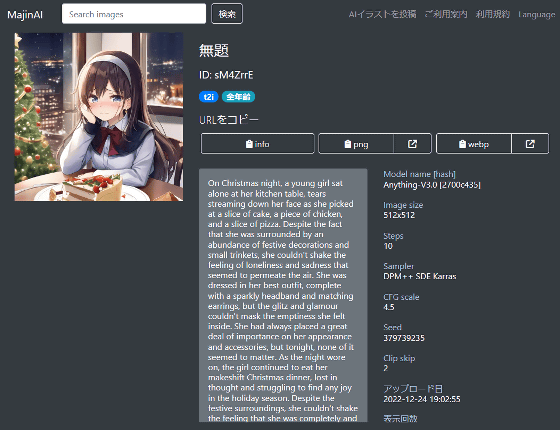 예를 들어, 아래의 상세 화면에는 " https://majinai.art/ko/i/sM4ZrrE "라는 URL이 할당되어 있습니다. 상세 화면에 직접 링크할 수 있으므로, 공유 및 즐겨찾기 등록에 편리합니다.