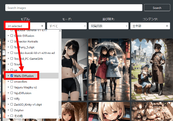 또한 일러스트 생성에 사용한 모델 데이터로 검색 결과를 좁힐 수도 있습니다. 테스트로 " Waifu Diffusion "을 선택했습니다.