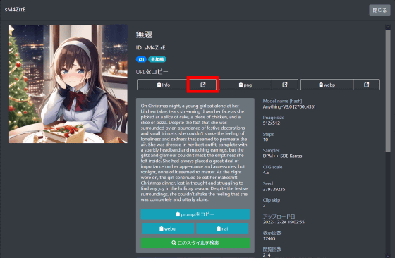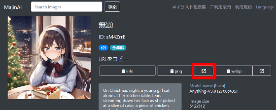 또한 MajinAI에서는 PNG 형식이나 WebP 형식의 이미지에 직접 링크할 수 있는 URL도 얻을 수 있습니다. 우선 "png"라고 표시된 부분의 링크 버튼을 클릭해 보았습니다.