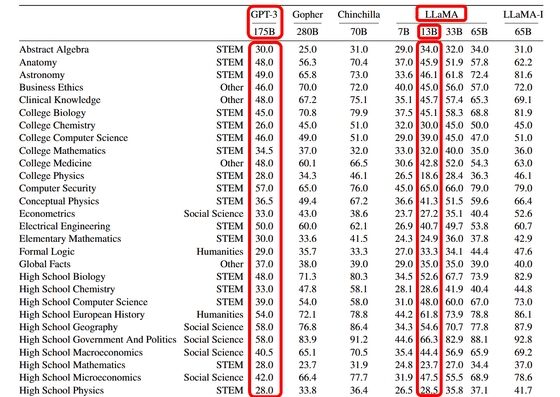 또한 Meta AI Research에 따르면 파라미터 수 130억의 LLAMA-13B를 단독 GPU로 실행하여 BoolQ, PIQA, SIQA , HellaSwag , WinoGrande , ARC , OpenBookQA 라는 8 개의 벤치마크로 '상식적 추론'을 측정한 바, 일부 테마에서는 파라미터 수 1,750억의 GPT-3를 웃도는 성능을 나타냈다는 것.