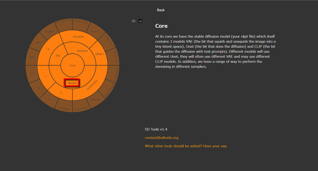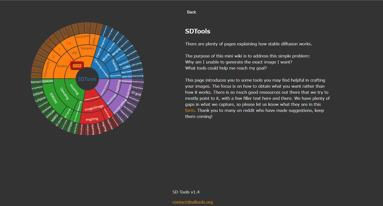 SD Toolset은 이런 느낌으로, 왼쪽의 화려한 동심원에 주제가 시각적으로 정리되어 있어, 동심원을 타고 들어가며 궁금한 카테고리를 클릭해 갑니다. 우선 예를 들어, Stable Diffusion의 근간을 알고 싶으니, "Core"를 클릭해 봅니다.