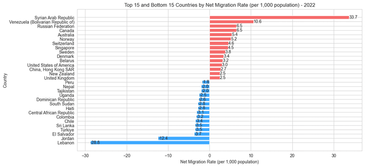 이입민(immigrant : 빨강)은 유럽이나 아시아의 선진국에 많고,