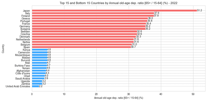 리서치 회사인 Steno Research가 산출한 데이터에 따르면 500만 명 이상의 인구를 가진 국가 중, 고령자 부양률이 높은 나라와 낮은 나라, 각각 상위 10개국을 뽑으면 아래와 같습니다.