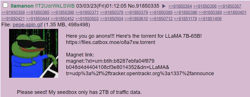 그러나 4chan에서 AI 채팅봇에 대해 말하는 스레드 중 2023년 3월 3일에 'llamanon !! T2UdrWkLSWB'라는 사용자가 갑자기 LLAMA-65B(매개변수 수 650억)의 '가중치' 데이터를 다운로드 가능한 토렌트 파일과 마그넷 링크를 공개했습니다.