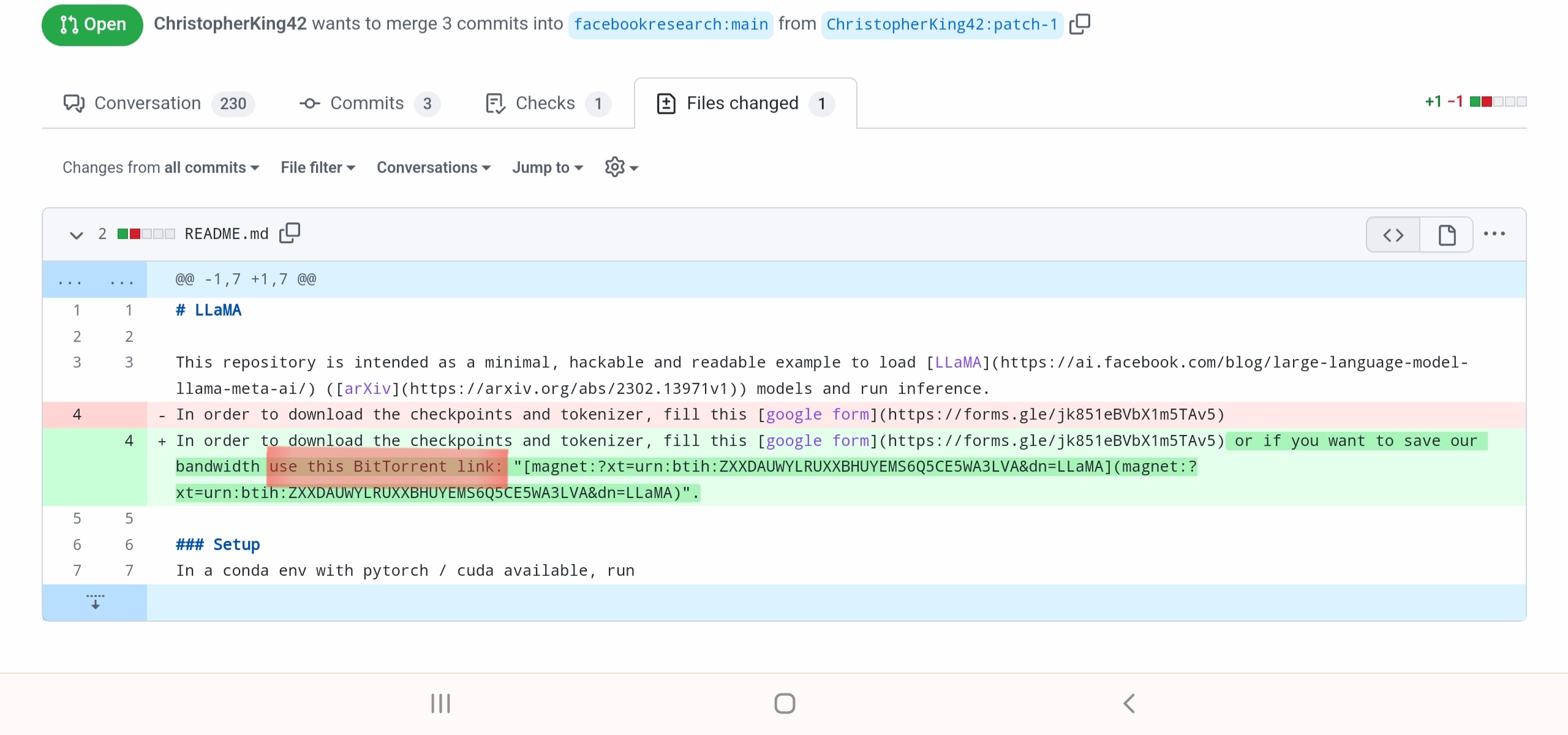 또한 GitHub에 위치한 LLAMA의 리포지토리는 4chan에 게시된 마그넷 링크 추가가 Pull Request되고 있습니다.