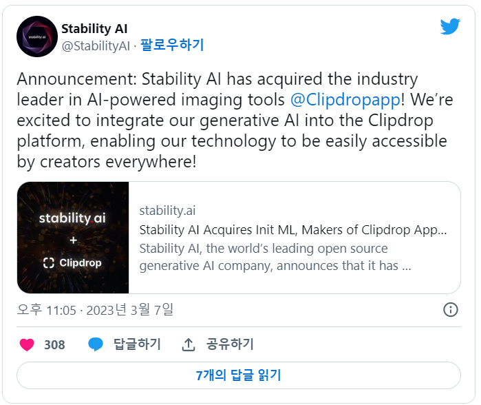 이미지 생성 AI「Stable Diffusion」의 개발사인「Stability AI」가 AR 앱「ClipDrop」등을 개발하는「Init ML」의 인수를 발표했습니다.