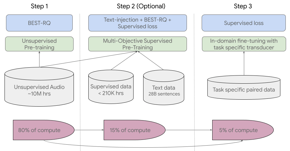 USM은 교육의 80%를 차지하는 첫 번째 단계에서 'BEST-RQ'라는 자기 교사 학습을 수행하고,