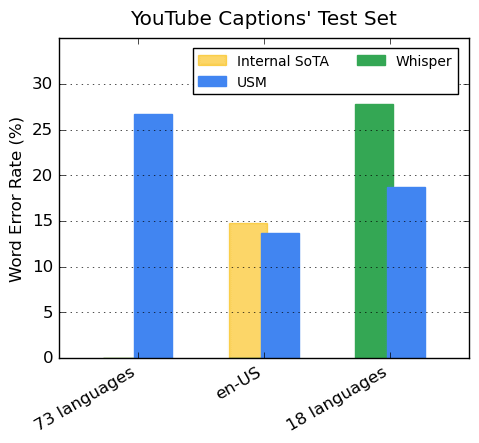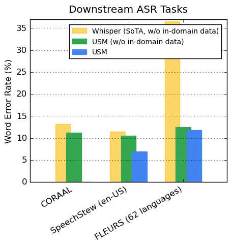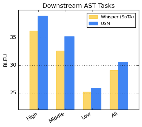 BLEU 점수는 더 높을수록 번역 정확도가 뛰어나다는 것을 보여 주며, 두 그룹 모두 USM이 위스퍼를 능가한다는 것을 알 수 있습니다.