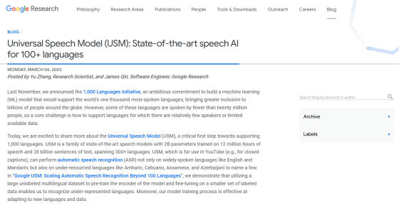 Google이, YouTube의 자막 생성에 이용되는 대규모 언어 모델「Universal Speech Model(USM)」을 300개 이상의 언어로 트레이닝하여, 비교적 마이너인 언어를 포함한 번역 태스크에서 매우 뛰어난 성능을 발휘했다고 보고했습니다.