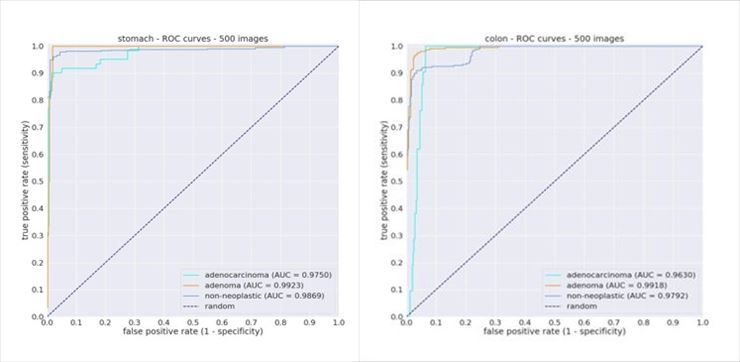 개발에는 슈퍼 컴퓨터 시스템이 사용되었으며, 시험 데이터에 의한 검증 결과, 기계 학습의 정확도 평가에 사용되는 지표 'AUC'이 모두 0.96 이상(1에 가까울수록 판별 능력이 높다)이라는 매우 높은 정밀도(병리 전문의의 정답률에 육박한 정도)를 얻기에 이르렀다는 것...