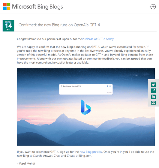 OpenAI가 차세대 대규모 언어 모델인 'GPT-4'를 발표한 직후, Microsoft가 'Bing에 통합한 채팅 AI는 GPT-4'였음을 밝혔습니다.