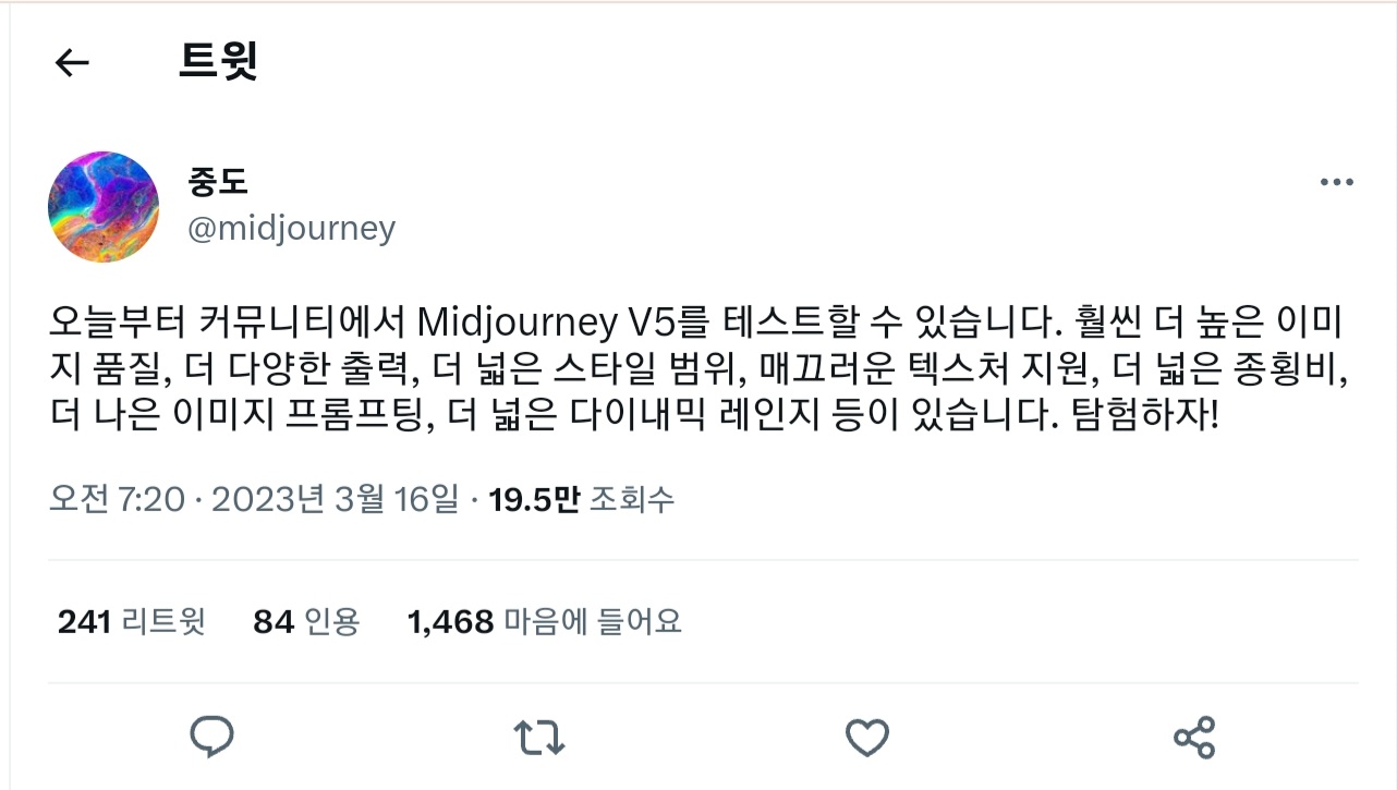 「Midjourney V5」는, 현 시점에서는 테스트 단계라고 합니다. Midjourney 관련 최신 정보는 다음 Discord 서버에 게시됩니다.