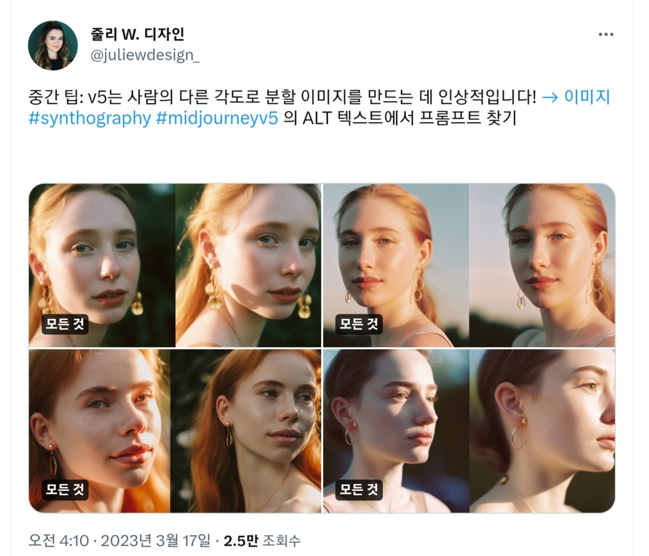 'Midjourney V5'에서 생성된 인간의 얼굴이나 손, 배경의 흐림 상태 등은 매우 자연스럽고, 따로 말하지 않으면 AI가 생성한 이미지인지 눈치채기 어려울 정도의 완성도입니다.