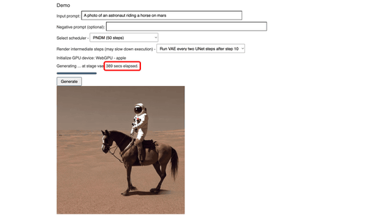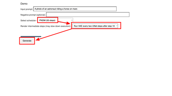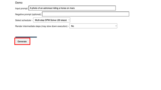 이번에는 기본 "A photo of an astronaut riding a horse on mars (화성에서 말을 타는 우주 비행사의 사진)" 프롬프트 그대로 "Generate"를 클릭합니다.
