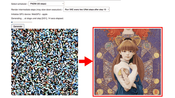 이번에는 "Select scheduler"에서 스케줄러의 스텝 수를, "Render intermediate steps"로 렌더링의 중간 스텝을 변경했습니다. 스케줄러의 스텝수는 20 스텝과 50 스텝에서 선택할 수 있습니다만, 50 스텝수가 이미지의 정밀도가 올라가는 만큼, 생성 시간이 더 걸립니다. 또한 렌더링의 중간 단계를 설정하면 생성 중인 노이즈가 표시되지만 생성하는데 시간이 오래 걸립니다.