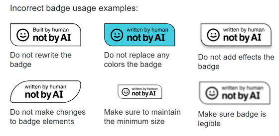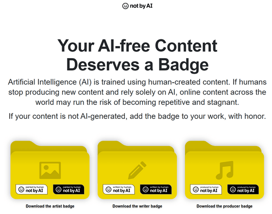 이러한 우려로 인해 시작된 것이 'Not By AI'라는 프로젝트입니다. 공식 사이트에서는, 콘텐츠 전체의 90% 이상이 사람의 손에 의해 만들어진 것에만 붙일 수 있는「Not By AI 배지」가 EPS 형식과 SVG 형식으로 배포되고 있어, 자유롭게 다운로드할 수 있습니다.