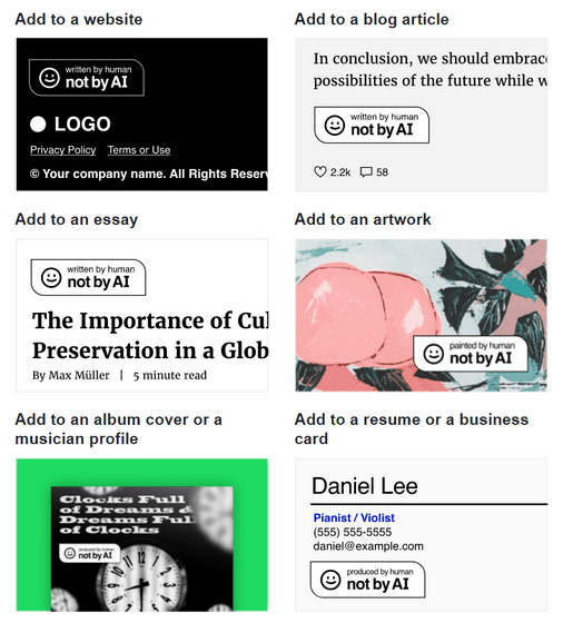 두 번째는 블로그, 에세이, 연구, 편지 등 텍스트 기반 콘텐츠에 사용하는 'Written By Human Not By AI 배지'.