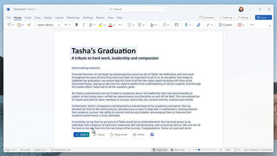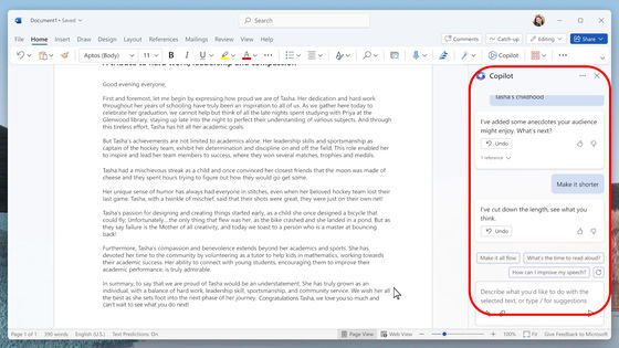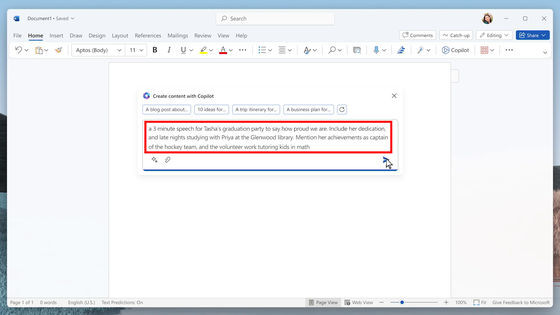 Word에서는「졸업 축하에서 말할 3분간의 스피치 원고」 작성을 Copilot에 의뢰합니다.