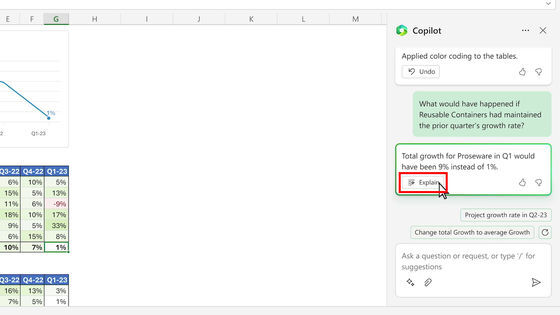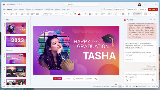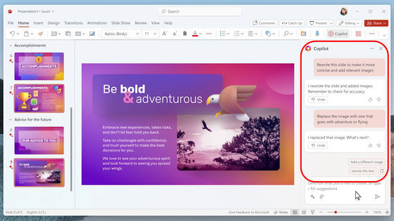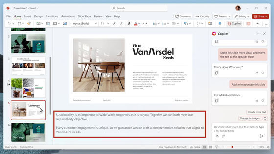화면 오른쪽에는 Copilot과의 채팅이 표시되어 여기에 세세한 지시를 입력하면 자료가 수정됩니다. PowerPoint를 사용하는 방법을 모르는 사람도 높은 품질의 프리젠 테이션 자료를 만들 수 있습니다.