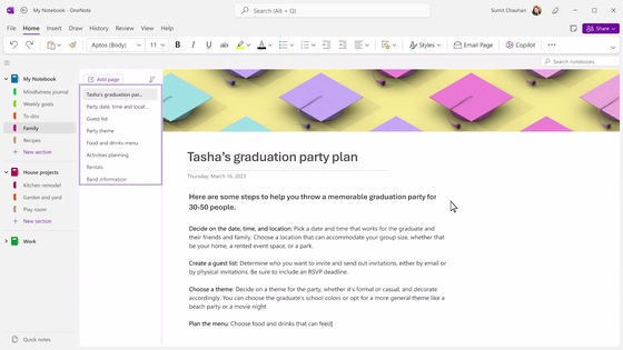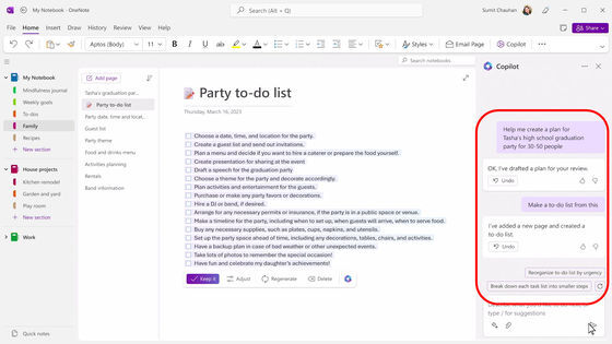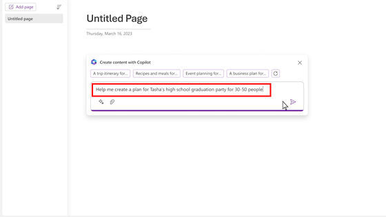 OneNote에서 "30명~50명 규모의 졸업을 축하하려는데, 계획 작성을 도와달라"라고 입력합니다.
