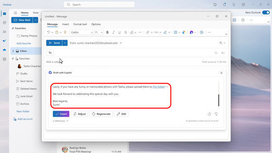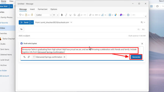 입력 프롬프트가 나타나면,「딸의 고등학교 졸업 축하에 친구나 친척을 초대하고 싶다」등, 작성하고 싶은 문장의 개요를 입력합니다.