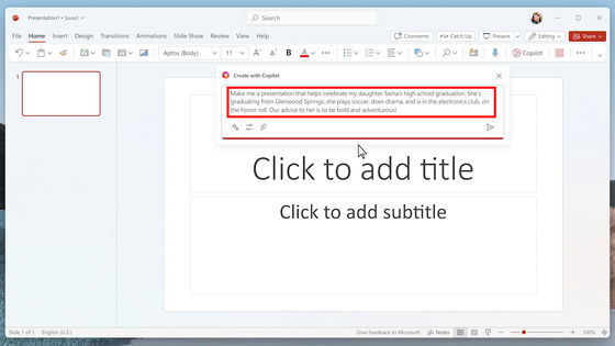 PowerPoint에서 Copilot으로 만들고 싶은 프레젠테이션 자료의 내용을 입력합니다.