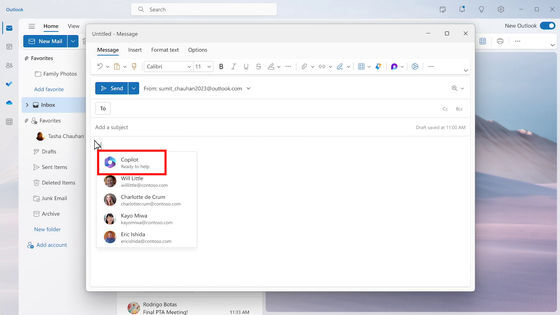 Outlook에서 메일을 신규 작성할 때 본문란의 메뉴에서 "Copilot"을 선택.