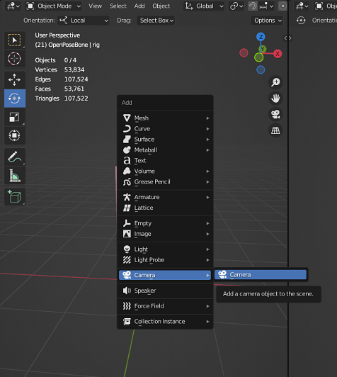 Object Mode로 변경하고 Shift+A를 눌러 카메라를 추가합니다.