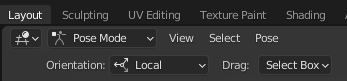 먼저 Layout 탭 바로 아래의 풀다운에서 PoseMode를 선택합니다(기본값은 ObjectMode).