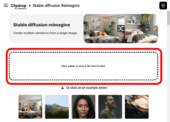 Stable diffusion reimagine에 액세스 하면 다음과 같은 화면이 표시됩니다. 화면의 점선으로 둘러싸인 부분에 이미지를 드래그 앤 드롭하면 "드래그 앤 드롭한 이미지와 비슷한 이미지"가 3장 생성됩니다.