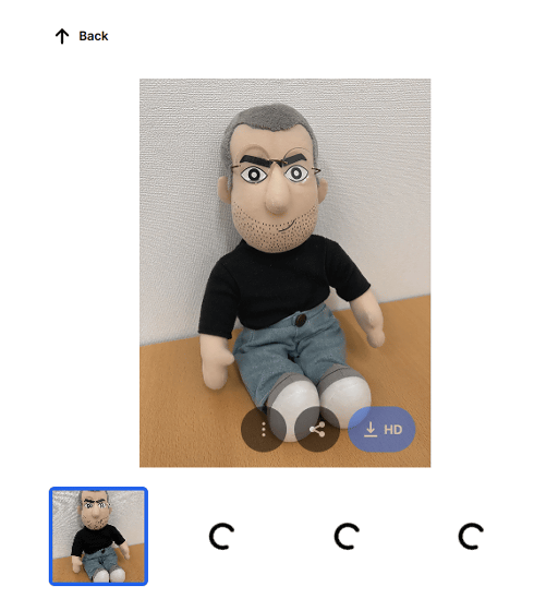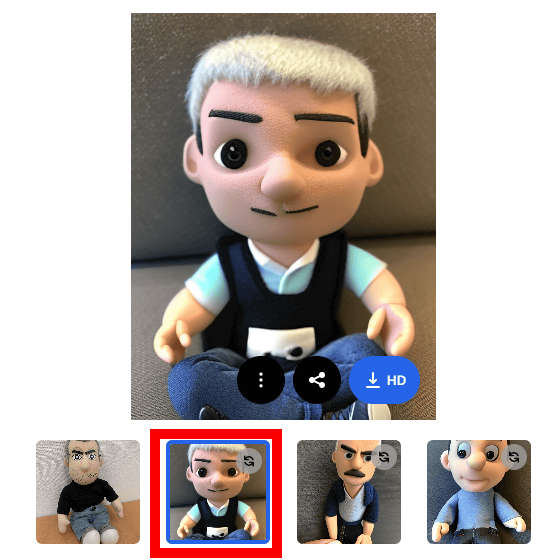 그러면 아래와 같이 "오리지널 이미지 1장(왼쪽 상단)과 생성 이미지 3장을 연결한 이미지"를 다운로드할 수 있습니다. 왼쪽 하단의 이미지에는 인간의 손가락이 찍혀 있지만, 대부분 "심플한 배경에 인형이 앉아있는 사진"이라는 특징을 재현할 수 있었습니다.