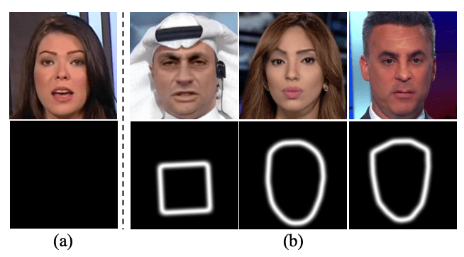 학습 데이터 세트로 이미지 ( I ), 그 이미지에 대응하는 Face X-ray ( B ), 이미지 ( I )의 혼합 유무 ( c ) 세트를 제공합니다.