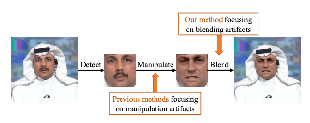 이 논문에서는 대부분의 딥 페이크 기법에 발생하는 혼합(Blend)에 의한 차이에 주목하여 딥 페이크 수법에 의존하지 않는 범용성 높은 검출 모델을 실현하고 있습니다.