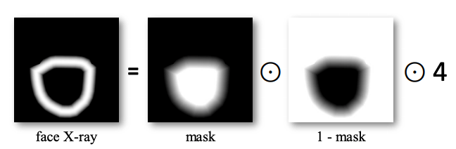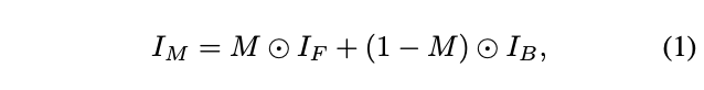 I B, I F, M 이 주어진다면, 식 (1)에서 혼합된 이미지 (I M)가 생성됩니다. 여기서 M 픽셀 값은 0.0 ~ 1.0의 그레이 스케일로 표시됩니다. 또한, 혼합 시에는 I B 의 색상과 일치하도록 I F 에 대해 색보정을 적용하고 있습니다. 또한 식 (2)에서 Face X ray (B)가 생성됩니다. 입력 이미지가 혼합되어 있지 않으면 B 는 모든 픽셀에서 0이 되도록 정의됩니다.