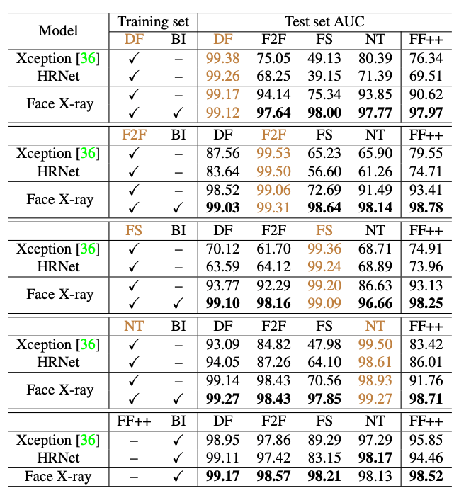 다음 표에서는 각 학습 데이터에 대한 딥 페이크의 AUC를 산출하고 있습니다.