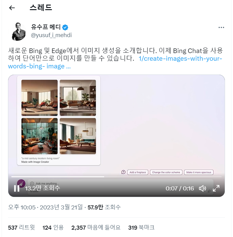 구체적으로 어떻게 동작하는지 참고할 영상을 최고 마케팅 책임자인 Yusuf Mehdi 씨가 공개하고 있습니다.