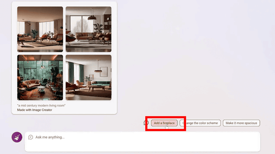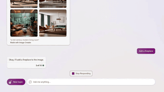 Bing이 "오케이, 벽난로를 추가합니다"라고 응답.