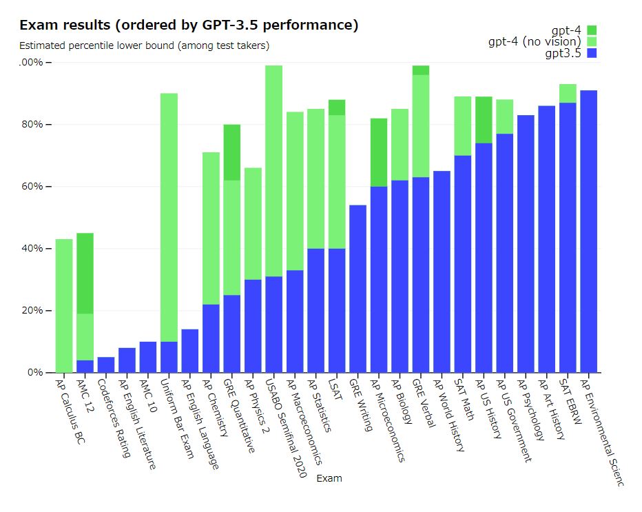 GPT-4 해설 기사 에는 GPT-4와 GPT-3.5를 비교하기 위해 실시한 각종 테스트의 결과가 정리되어 있습니다. 미국의 사법 시험을 비롯한 인간이 수험하는 테스트를 이러한 모델에 회답시킨 결과를 정리한 것이 아래의 그래프입니다.