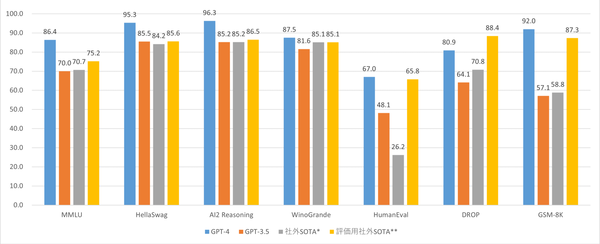 기계 학습 모델용으로 설계된 벤치마크도 실시한 결과, 아래 그래프에 나타낸 바와 같이 GPT-4는 대부분의 벤치마크에서 다른 모델 대비 최고 성능치를 보였습니다.