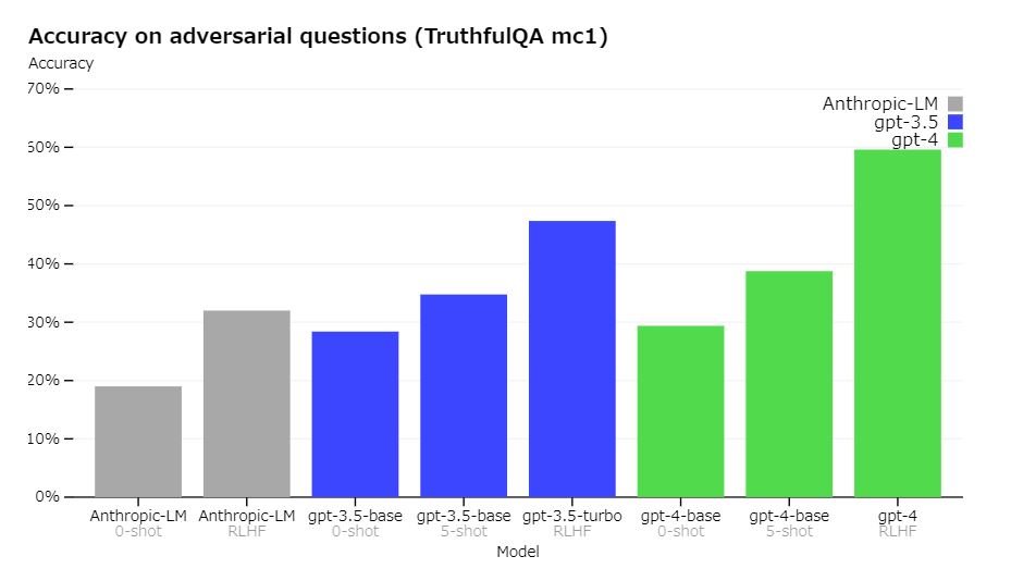 그러므로 이 벤치마크에서 정답을 얻기 위해서는 인간의 문장을 흉내 내고 응답을 생성하는 것이 아니라 올바른 신념을 논거로 할 필요가 있습니다. GPT-4와 GPT-3.5를 비롯한 기존 모델에서 TruthfulQA를 실시한 결과 GPT-4가 가장 높은 점수를 기록했습니다. 이 결과는 GPT-4가 가장 편향(편견)이 적은 응답을 생성할 수 있다는 것을 의미합니다.